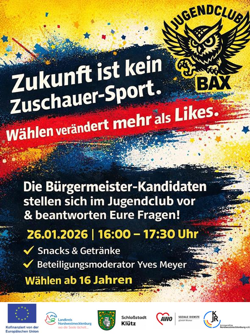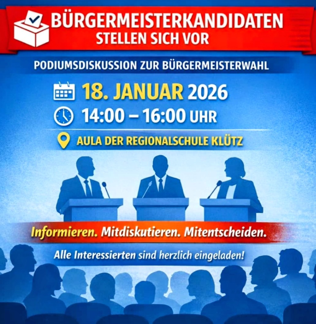 Die Wahl des ehrenamtlichen Bürgermeisters der Stadt Klütz findet am Sonntag, 1. Februar 2026, statt.